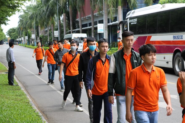 Sinh viên chuẩn bị lên xe di chuyển về Công ty TNHH Sailun Việt nam ở Tây Ninh