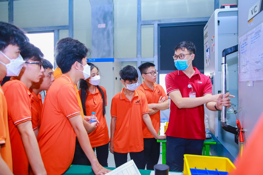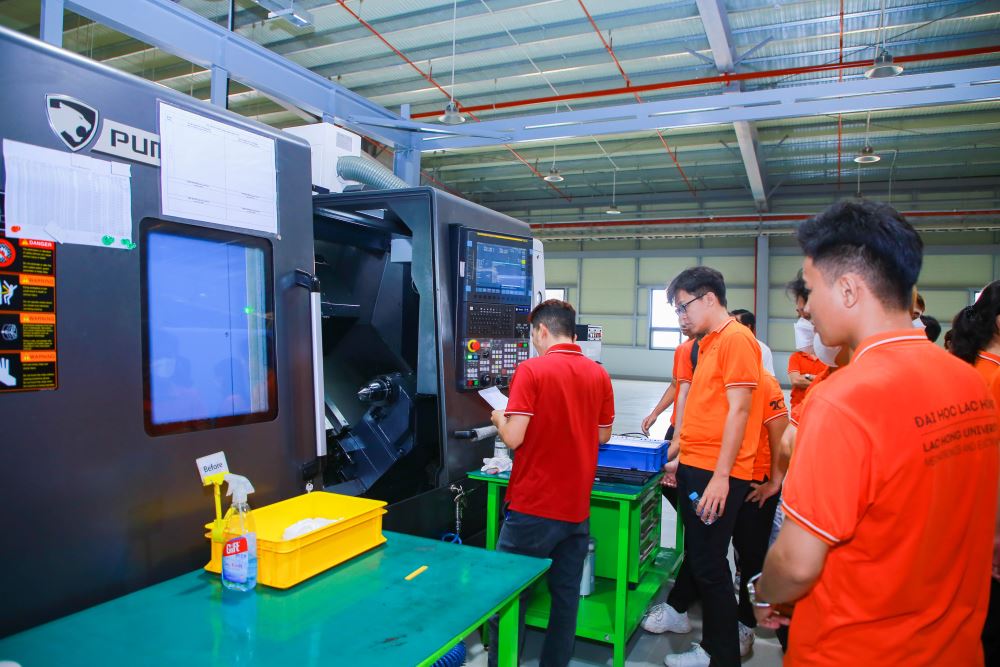 Sau khi đại diện công ty và đại diện Trung tâm Tuyển sinh & Quan hệ công chúng phát biểu giới thiệu về đơn vị, các em sinh viên được các chuyên gia của công ty đưa đi tham quan, trải nghiệm tại các phân xưởng cơ khí của nhà máy với những trang thiết bị hiện đại. Sinh viên được nghe giới thiệu về quá trình thiết kế, gia công chế tạo sản phẩm trên các máy CNC. Quá trình tham quan các phân xưởng gia công cơ khí trên các máy CNC mang lại cho các bạn nhiều cảm xúc và trải nghiệm riêng giúp các bạn có cái nhìn thực tế, từ đó hiểu hơn về chuyên ngành đã chọn, hiểu được vị trí việc làm của mình sau khi ra trường từ đó có thêm động lực trong học tập và rèn luyện để đáp ứng được nhu cầu việc làm tại doanh nghiệp.