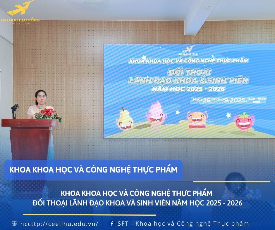 Ngày 26/9/2025 tại phòng I 209, nhằm lắng nghe và đồng hành cùng sinh viên trong quá trình học tập, rèn luyện và sinh hoạt, Khoa Khoa học và Công nghệ Thực phẩm, Trường Đại học Lạc Hồng đã tổ chức buổi đối thoại giữa Ban lãnh đạo Khoa và Sinh viên năm học 2025 - 2026. Đây cũng chính là dịp để thầy và trò cùng chia sẻ, thấu hiểu và xây dựng một môi trường học tập ngày càng chất lượng, thân thiện và sáng tạo.
