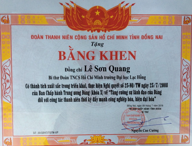 Với những kết quả đạt được trong quá trình thực hiện Nghi quyết dưới sự chỉ đạo của Tỉnh đoàn Đồng Nai, sự quan tâm tạo điều kiện của Đảng ủy, Ban Giám hiệu nhà trường. Đoàn trường Đại học Lạc Hồng đã vinh dự được Ban Thường vụ tỉnh Đoàn Đồng Nai tặng bằng khen tại hội nghị tổng kết 10 năm thực hiện Nghị quyết.