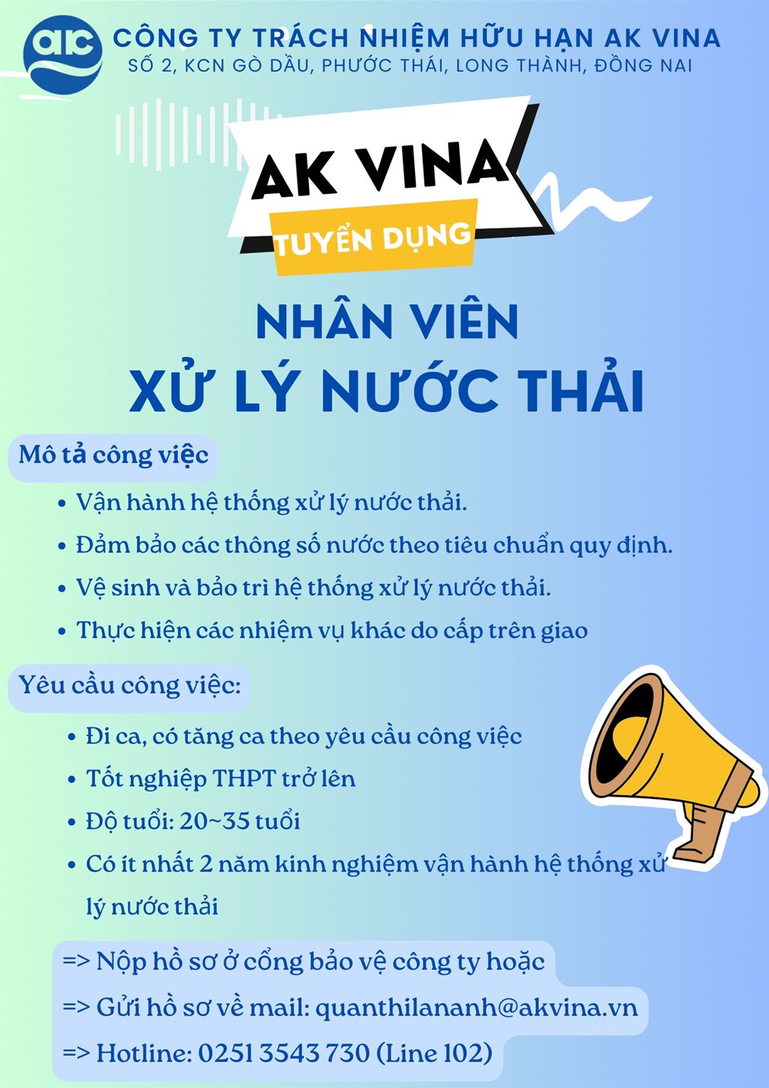 CÔNG TY TRÁCH NHIỆM HỮU HẠN AK VINA tuyển dụng nhân viên ngành Môi trường