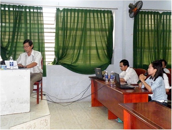 Bạn Nguyễn Trần Quốc Duy,Lê Hoàng Lâm (ngồi đầu bàn) báo cáo tiến độ đề tài: “Xây dựng công cụ tạo câu hỏi trắc nghiệm theo định dạng gift”.