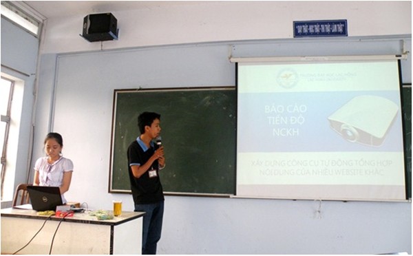 Nguyễn Thế Huy, Thái Phạm Thảo Ly trình bày đề tài “Xây dựng công cụ tự động tổng hợp nội dung của nhiều Website khác”.
