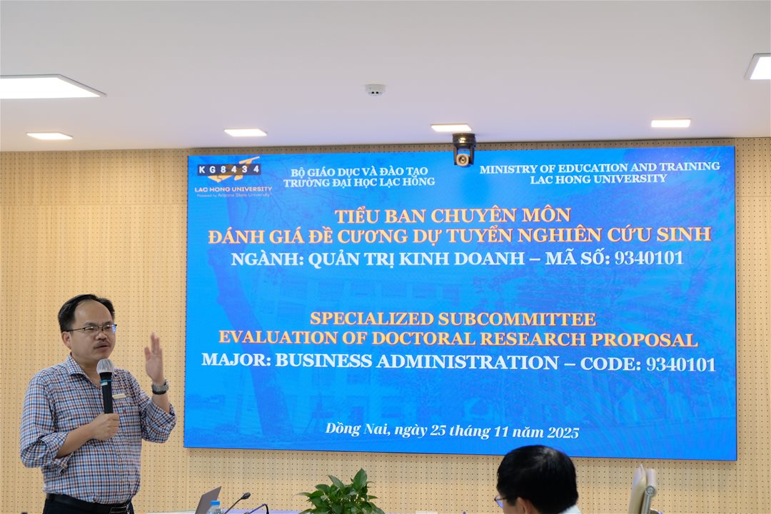Ngày 25/11/2025 tại phòng họp cơ sở 1 Trường Đại học Lạc Hồng, Khoa Sau đại học đã tổ chức Tiểu ban chuyên môn đánh giá đề cương dự tuyển tiến sĩ ngành Quản trị kinh doanh năm 2025 - Đợt 4.