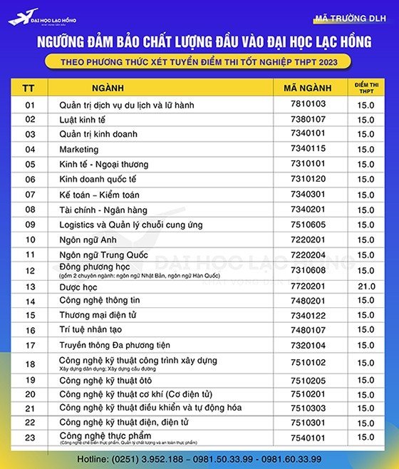 Trường Đại học Lạc Hồng (LHU) chính thức công bố ngưỡng đảm bảo chất lượng đầu vào đại học năm học 2023 - 2024 theo các phương thức như sau: