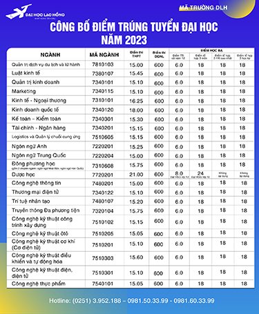 Trường Đại học Lạc Hồng thông báo xét tuyển bổ sung cho 24 ngành đào tạo hệ đại học chính quy, năm 2023 cho phương thức xét tuyển dựa vào Kết quả thi THPT và phương thức xét tuyển học bạ, phương thức xét tuyển bằng kỳ thi đánh giá năng lực.