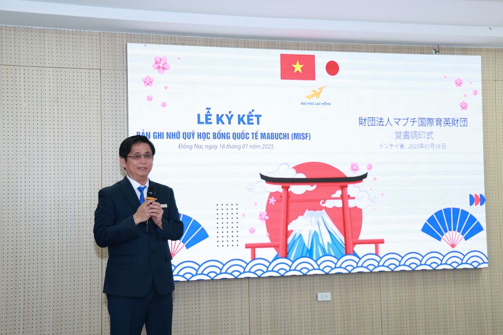 Phát biểu tại sự kiện, TS Lâm Thành Hiển - Hiệu trưởng LHU xúc động kể lại câu chuyện về lần gặp gỡ đầu tiên giữa thầy và ngài Kamei Shinji trong đợt cổ vũ sinh viên LHU tại cuộc thi Robocon châu Á - Thái Bình Dương 2014. Từ đó mở ra sự kết nối và hỗ trợ từ trang thiết bị cho sinh viên chế tạo robot cho đến quỹ học bổng dành cho sinh viên LHU: “Học bổng Mabuchi là một sự hỗ trợ ý nghĩa, được tạo ra từ lòng tin tưởng và cam kết mạnh mẽ của những nhà tài trợ quốc tế, những người mong muốn đầu tư vào giáo dục và nuôi dưỡng thế hệ trẻ có năng lực và phẩm chất đạo đức cao. Khi nhận được sự giúp đỡ này, các bạn không chỉ đại diện cho sự xuất sắc của bản thân, mà còn mang trong mình niềm tin và kỳ vọng của gia đình, nhà trường và cả cộng đồng. Đồng thời, học bổng cũng nhắc nhở chúng ta về tầm quan trọng của giáo dục, sự chia sẻ và trách nhiệm xã hội trong việc xây dựng một thế giới tốt đẹp hơn. Nguồn quỹ này hoàn toàn “không cho luôn” các bạn. Hãy nghĩ rằng, hôm nay chúng ta khó khăn, chúng ta được “nương tựa” và chính mỗi chúng ta sẽ có trách nhiệm “hoàn trả lại” để tiếp tục giúp đỡ cho những người còn đang khó khăn. Sau khi hoàn thành nghĩa vụ “trả nợ”, bạn sẽ góp phần tái tạo nguồn lực cho các thế hệ sinh viên tiếp theo. Qua đó, tạo nên chuỗi kết nối bền vững, lan tỏa tinh thần nhân văn và trách nhiệm xã hội... Đây là thông điệp của quỹ học bổng Mabuchi và cũng chính ta điều mà thầy muốn nhắn gửi đến các em.”