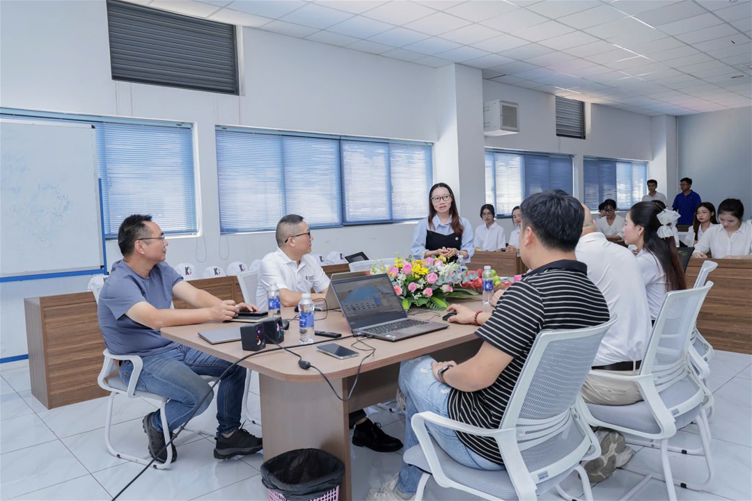 Sau phần chia sẻ, sinh viên được tham quan trực tiếp khu vực làm việc và dây chuyền sản xuất của công ty. Đại diện các phòng ban đã hướng dẫn sinh viên tham quan văn phòng, khu vực vận hành, phòng dịch thuật và trung tâm điều phối đơn hàng quốc tế. Qua đó, sinh viên có cơ hội quan sát quy trình làm việc thực tế, tìm hiểu cách ứng dụng tiếng Trung trong giao tiếp nội bộ và phối hợp công việc giữa nhân viên Việt Nam và Trung Quốc.