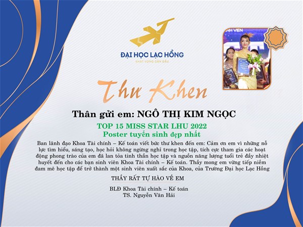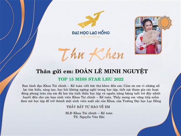 The citation of the letter done by the media department of the FFA : ”Thanks for your non-stop efforts of inquiring, studying, creating and positively enrolling in the activities which bring the enthusiasm, the energy of youth and academic spirit to the FFA students. I hope that you will pursue the passion of studying to become an excellent student of the Faculty at LHU”.
