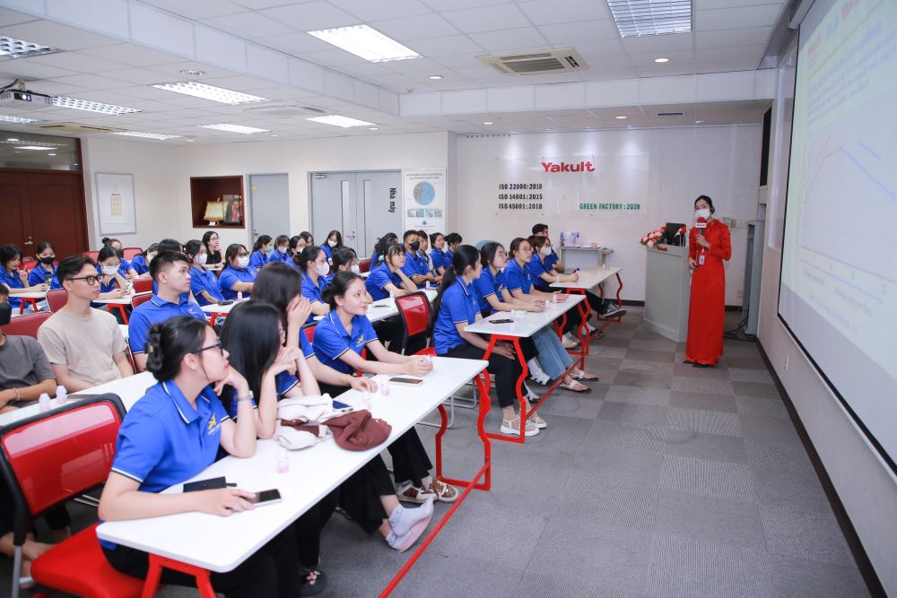 The students were warmly welcomed by the management team and staff of Yakult Vietnam Limited Company. The tour began with an overview presentation on the company's history, production processes, and corporate culture. Students had the chance to observe the production process of the famous probiotic beverage, from raw materials to the finished product.