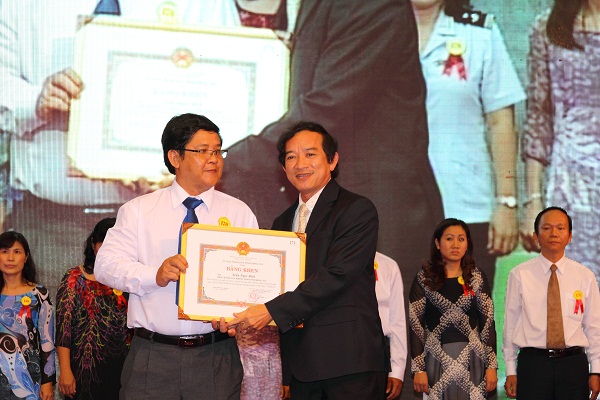 Vice Chairman of provincial People’s Committee Nguyen Thanh Tri awards cerificate of merit to Mr. Tran Minh Man (white shirt).