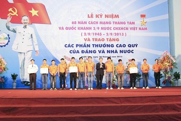In the morning of August 30, LHU delegation including Secretary of Party Committee Nguyen Trung Phuong, Vice Rector Dr. Nguyen Thi Thu Lan, Vice Rector - Chairman of Labor Union Dr. Diep Cam Thu, Vice Rector - Vice Chairman of Labor Union Dr. Nguyen Van Nam, Secretary of Youth Union Le Son Quang, Dean of Electro Mechanics - Head of Robocon delegation Nguyen Ba Thuan, M.A, representatives of units, instructors and members of Robocon teams 2013 gathered at Dong Nai province Sports House to attend a ceremony to celebrate the 68th anniversary of the August Revolution (August 19) and National Day (September 2) and to award Party and Nation's noble rewards to excellent individuals and collectives.