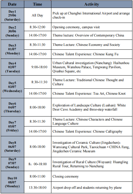 Chương trình kéo dài 10 ngày cho phép người tham gia hiểu biết sâu sắc về Trung Quốc tuyệt vời, tìm hiểu thêm về xã hội, văn hóa truyền thống và văn minh kinh tế Trung Quốc, đồng thời tham quan một số địa điểm nổi tiếng ở tỉnh Giang Tây.
