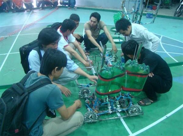 Một trận bóng sôi động giữa các thành viên làm robot của hai trường.