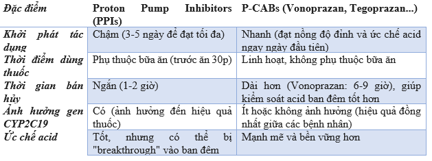 Trong nhiều năm, Proton Pump Inhibitors (PPIs) như omeprazole, lansoprazole là "tiêu chuẩn vàng" trong điều trị các bệnh lý liên quan đến acid dạ dày. Tuy nhiên, PPIs vẫn tồn tại những hạn chế về dược động học như khởi phát tác dụng chậm, thời gian bán hủy ngắn và sự biến thiên trong chuyển hóa qua CYP2C19. P-CABs ra đời như một giải pháp thay thế tiềm năng với cơ chế tác động khác biệt và ưu việt hơn.