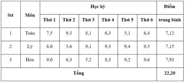 Lấy ví dụ tính điểm xét tuyển học bạ theo tổ hợp môn D00 (Toán, Lý, Hóa). Điểm 6 học kỳ của ba môn lần lượng như sau: