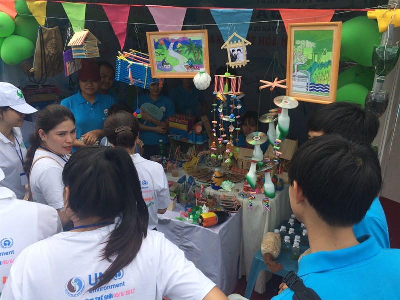 At the festival, the organizers set up 20 booths, divided into various areas: waste-for-gift exchange; recycled crafts workshops; exhibitions of environmental-themed paintings, photographs, and recycled products; a drawing area for children; displays of green technologies and eco-friendly products by businesses; and games and quizzes to raise awareness about the 3Rs (reduce – reuse – recycle).