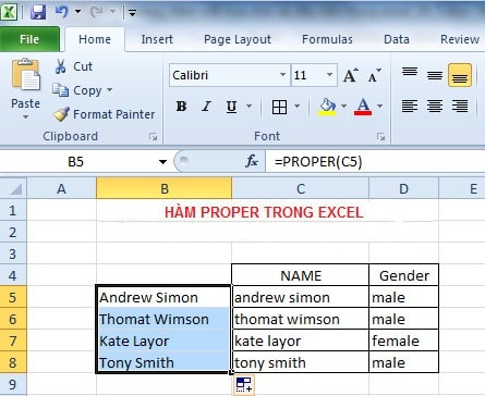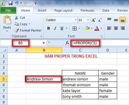 + Tại ô B5 ta gõ như sau B5=PROPER(C5) sau đó nhấn Enter ta được kết quả