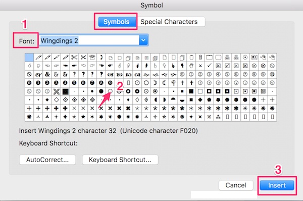 Bước 2: Cửa sổ Symbol sẽ hiển thị, trước tiên chọn Font, thường là WinWindings 1, Wingdings 2, Wingdings 3 là các Font được sử dụng phổ biến. Chọn ký hiệu bạn cần -> Insert