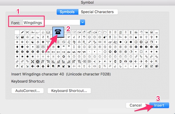 Ví dụ: Nếu muốn chèn biểu tượng điện thoại vào Word thì làm như sau: Insert->Symbol, chọn font Wingdings hoặc Wingdings 2, sau đó chọn ký hiệu điện thoại rồi nhấn nút Insert