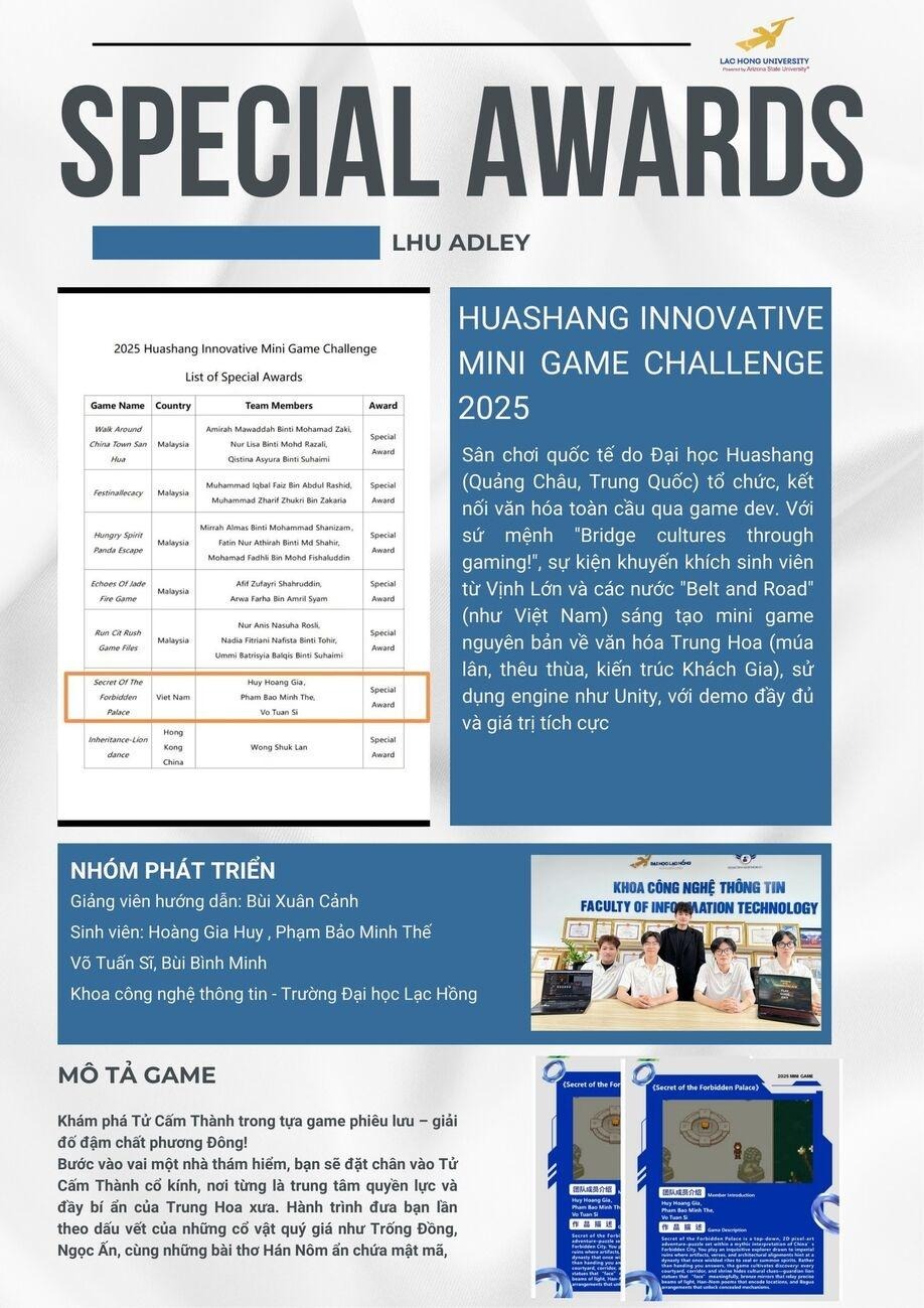 Trong không khí hân hoan của Khoa Công nghệ Thông tin – Trường Đại học Lạc Hồng, chúng ta cùng nhìn lại hành trình đặc biệt của đội LHU Adley gồm bốn sinh viên Hoàng Gia Huy, Phạm Bảo Minh Thế, Bùi Bình Minh và Võ Tuấn Sĩ – những gương mặt trẻ đã viết nên trang mới cho thành tích quốc tế của nhà trường khi giành Giải Đặc Biệt tại Huashang Innovative Mini Game Challenge 2025.