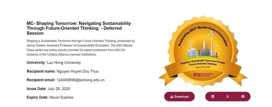 Students from Lac Hong University have officially received over 270 digital badges, which are international skills credentials from Arizona State University (ASU - the #1 university for innovation in the USA). These were awarded after they successfully completed courses from the ASU Master Class program during the Summer 2025 session.