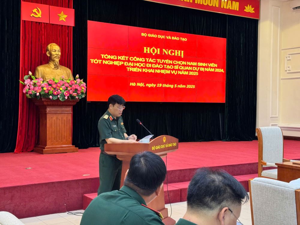 Vào lúc 8 giờ 30 phút ngày 14 tháng 05 năm 2025, Tại Hội trường A, tầng 2, nhà B, Bộ Giáo dục và Đào tạo, số 35 Đại Cồ Việt, quận Hai Bà Trưng, thành phố Hà Nội đã tổ chức Hội nghị tổng kết công tác tuyển chọn nam sinh viên tốt nghiệp đại học đi đào tạo sĩ quan dự bị năm 2024.