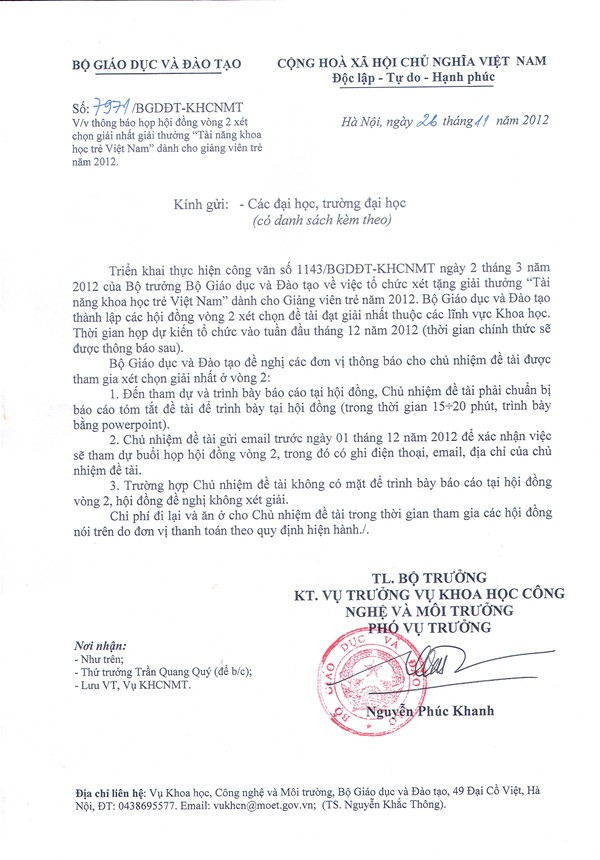 Danh sách đề tài được xét chọn giải Nhất, Nhì giải thưởng "Tài năng khoa học trẻ VN" năm 2012 dành cho giảng viên trẻ